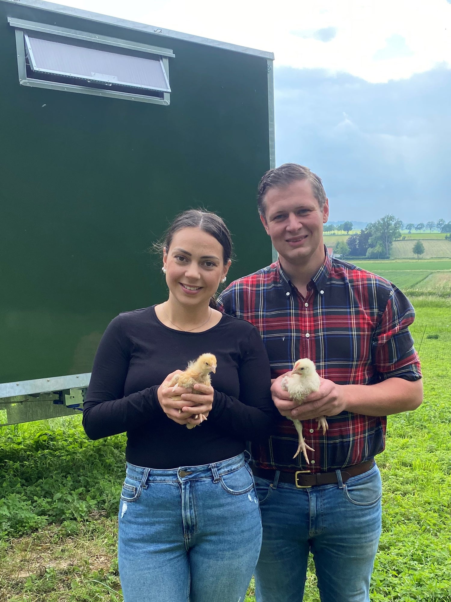 Die Hähnchen von Ruven & Nina leben in einem Mobilstall im Ambergau. Auf ihren Weiden können die Hähnchen ausgiebig Scharren, Picken und Sandbaden.