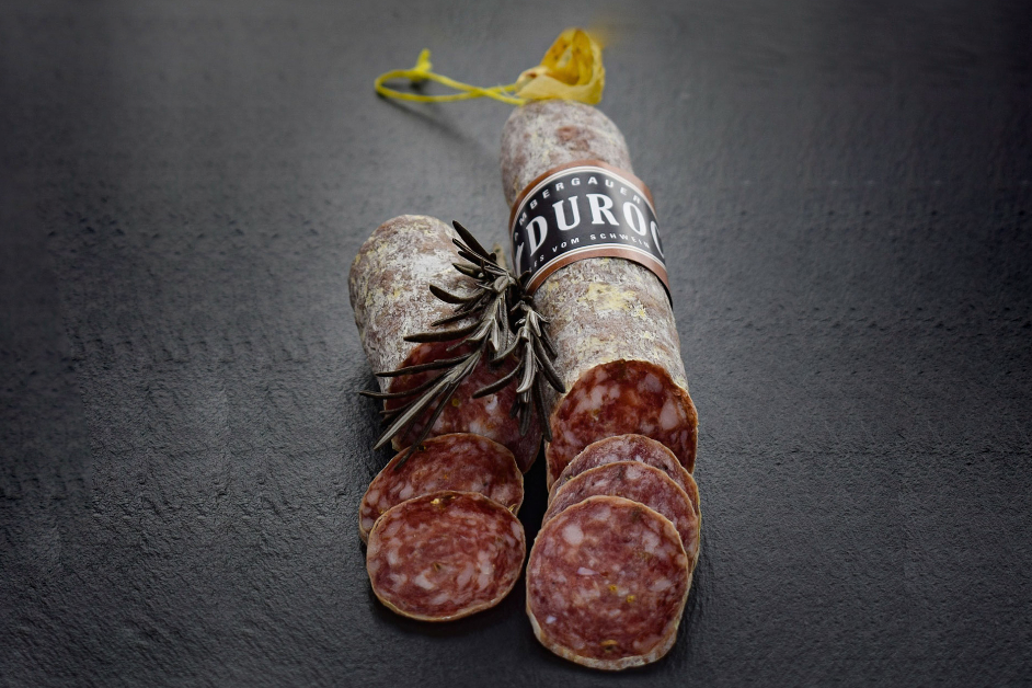 Zutaten: 77 % mageres Schweinefleisch, 23 % kerniger Rückenspeck, schwarzer Pfeffer, Fenchel, frischer Knoblauch, Muskat, Koriander, Zucker, Salpeter.