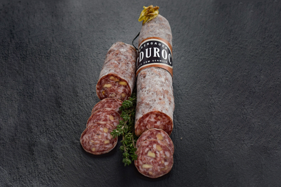 Zutaten: 77 % mageres Schweinefleisch, 23 % kerniger Rückenspeck, schwarzer Pfeffer, Walnüsse, frischer Knoblauch, Muskat, Koriander, Zucker, Salpeter.
